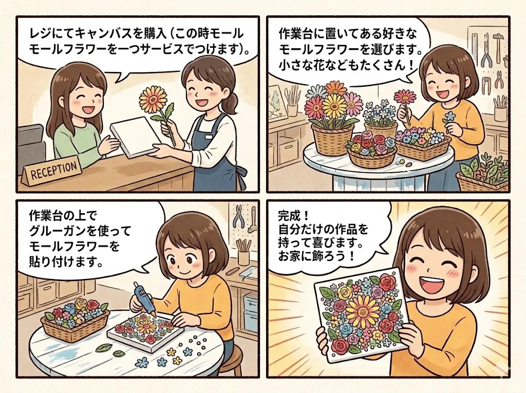 お店のスタッフに「モールフラワーでキャンバス作りたい!」とお伝えくださったら、案内させていだきますね